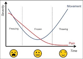 • Fase 1 (freezing phase): Pada fase ini anda akan merasakan nyeri hebat pada area bahu dan sekitarnya. Kondisi ini akan terasa secara intens dan bertambah buruk di malam hari. Biasanya secara perlahan rasa kaku juga muncul dan berlangsung selama 2 hingga 9 bulan