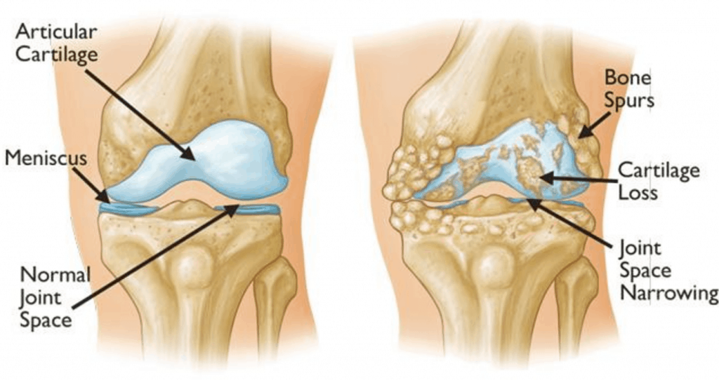 Ini merupakan radang sendi yang paling umum terjadi dan biasanya menyerang usia lanjut. Kondisi ini dapat menyebabkan nyeri dan bengkak pada area sendi lutut karena kondisi tulang rawan yang sudah rusak akibat faktor degeneratif. Kerusakan tulang rawan ini membuat tulang tungkai saling bergesekan sehingga menimbulkan gangguan pergerakan sendi dan pembengkakan.