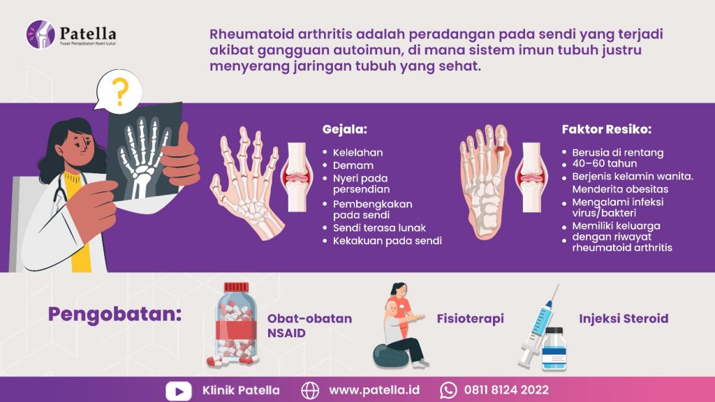 Rheumatoid arthritis (RA) adalah penyakit autoimun kronis yang ditandai oleh peradangan pada sendi. Ini adalah penyakit yang mempengaruhi sistem kekebalan tubuh, dimana sistem kekebalan tubuh secara keliru menyerang jaringan sendi, menyebabkan peradangan dan kerusakan pada persendian. Penyakit ini dapat menyerang bagian tubuh manapun dan sebaiknya harus segera ditangani agar tidak semakin parah dan menyebabkan kesulitan menggerakkan tubuh.